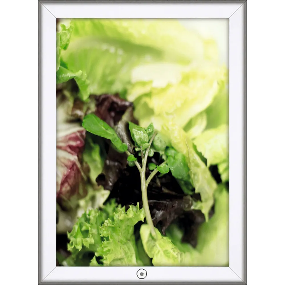 Plakat skiftes ved at profilene på rammen vippes ut og plakaten legges bak dekkplasten.