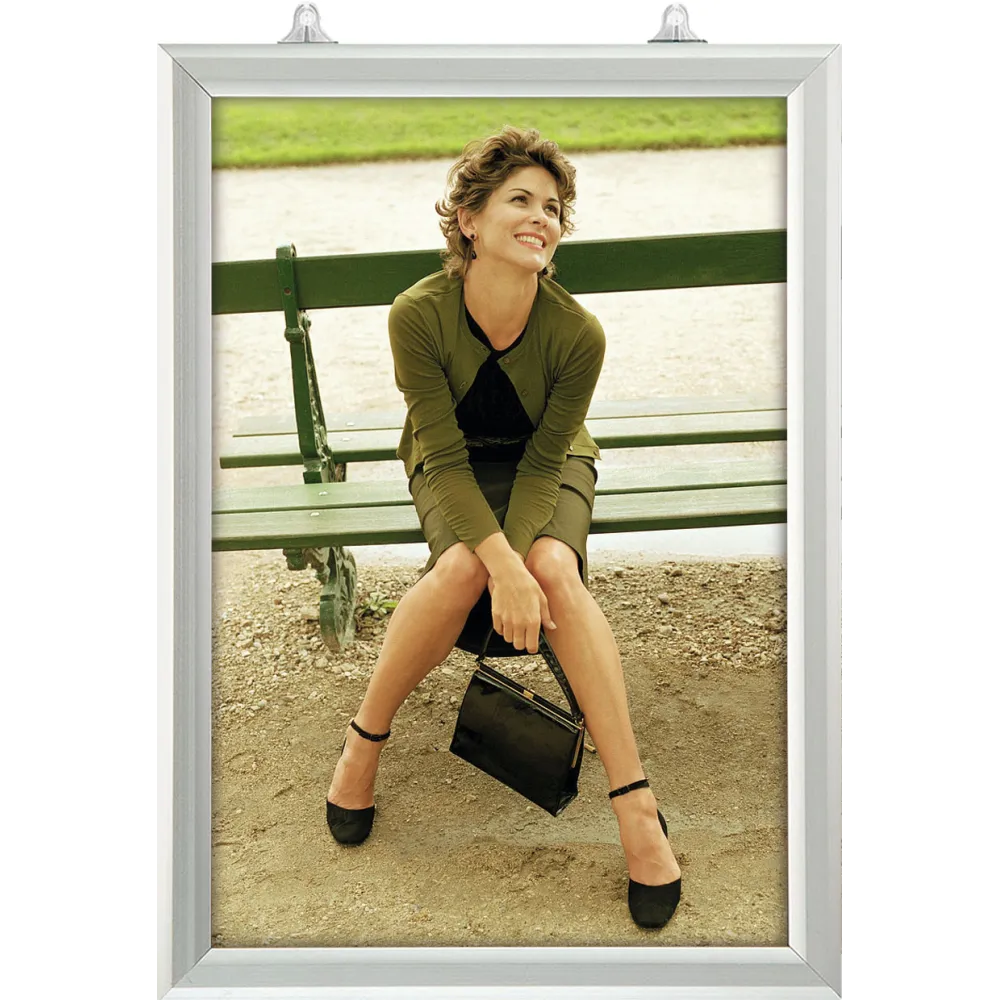 Plakat settes inn i sporet på siden av rammen, plakaten legges mellom de 2 dekkplastene.