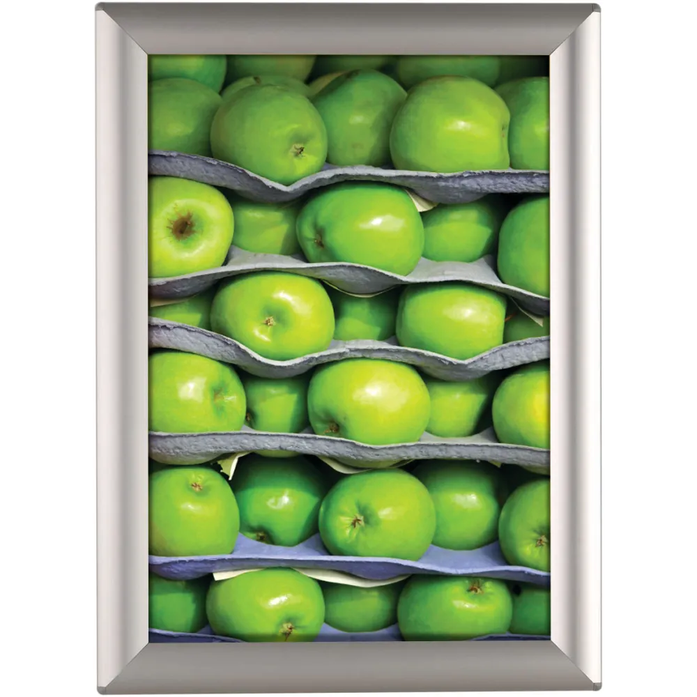 Plakatramme i aluminium, med dekkplast og formstøpt bakplate i polystyren.