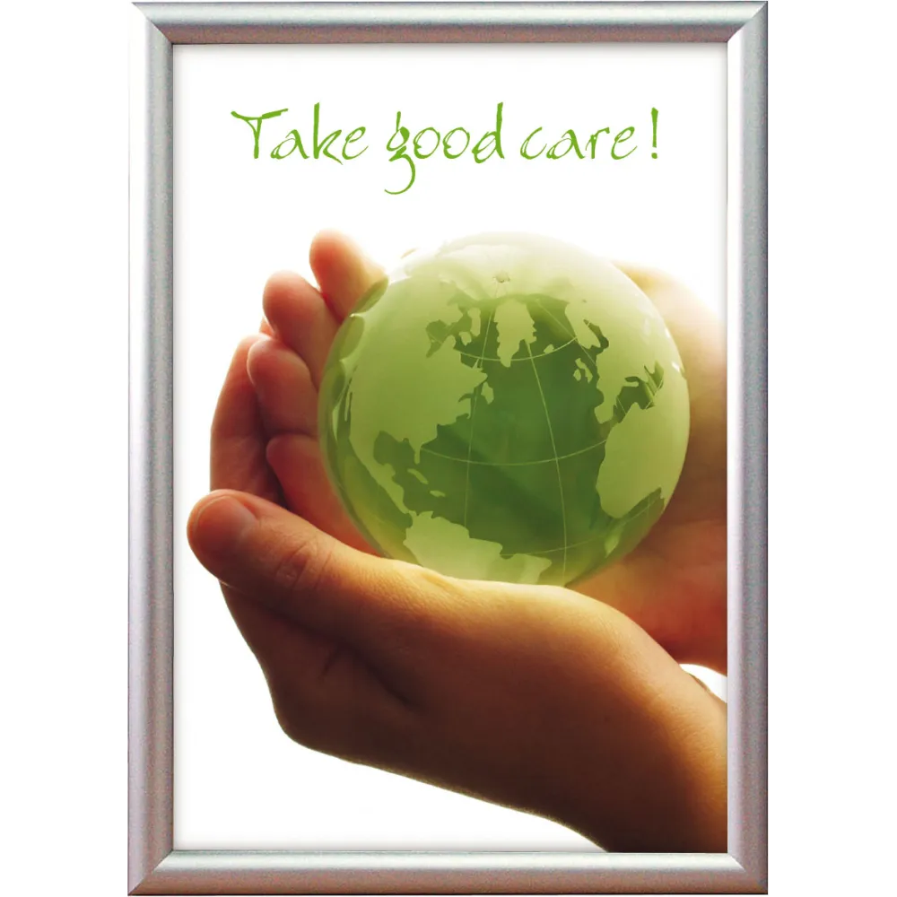 Plakat skiftes ved at profilene på rammen vippes ut og plakaten legges bak dekkplasten.