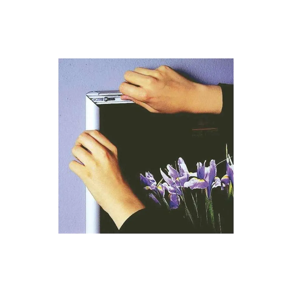 Plakat skiftes ved at profilene på rammen vippes ut og plakaten legges bak dekkplasten.