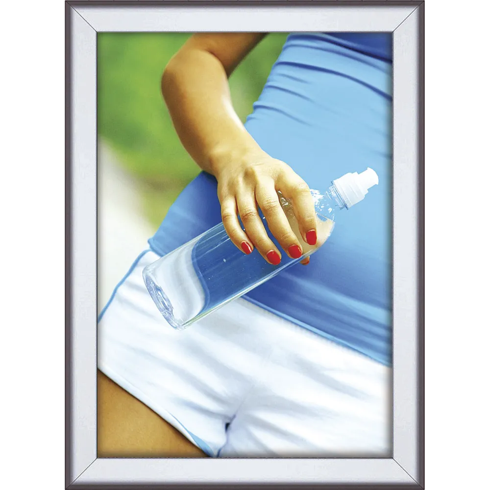 Plakat skiftes ved at profilene på rammen vippes ut og plakaten legges bak dekkplasten.