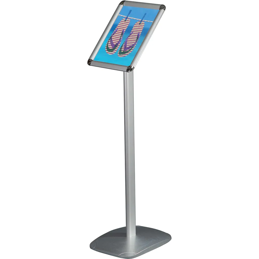 Infostativ med kraftig fot. A3 Snapramme med 25 mm profil med runde sølvhjørner.