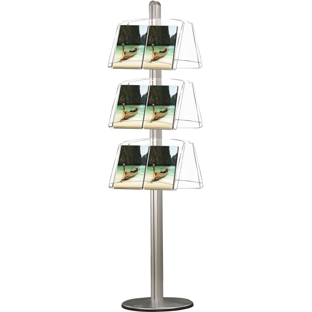 Dobbelsidig eloksert aluminium stander med 6 x A3 akrylhyller. Plass for 6 x A3 brosjyrer eller 12 x A4 brosjyrer.
