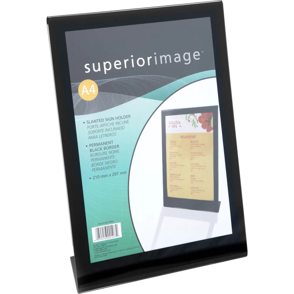 Skråstilt holder i klar polystyren, med en sort ramme for å fremheve informasjonen,samt å gi det en finere innramming. Beregnet for ett ark.