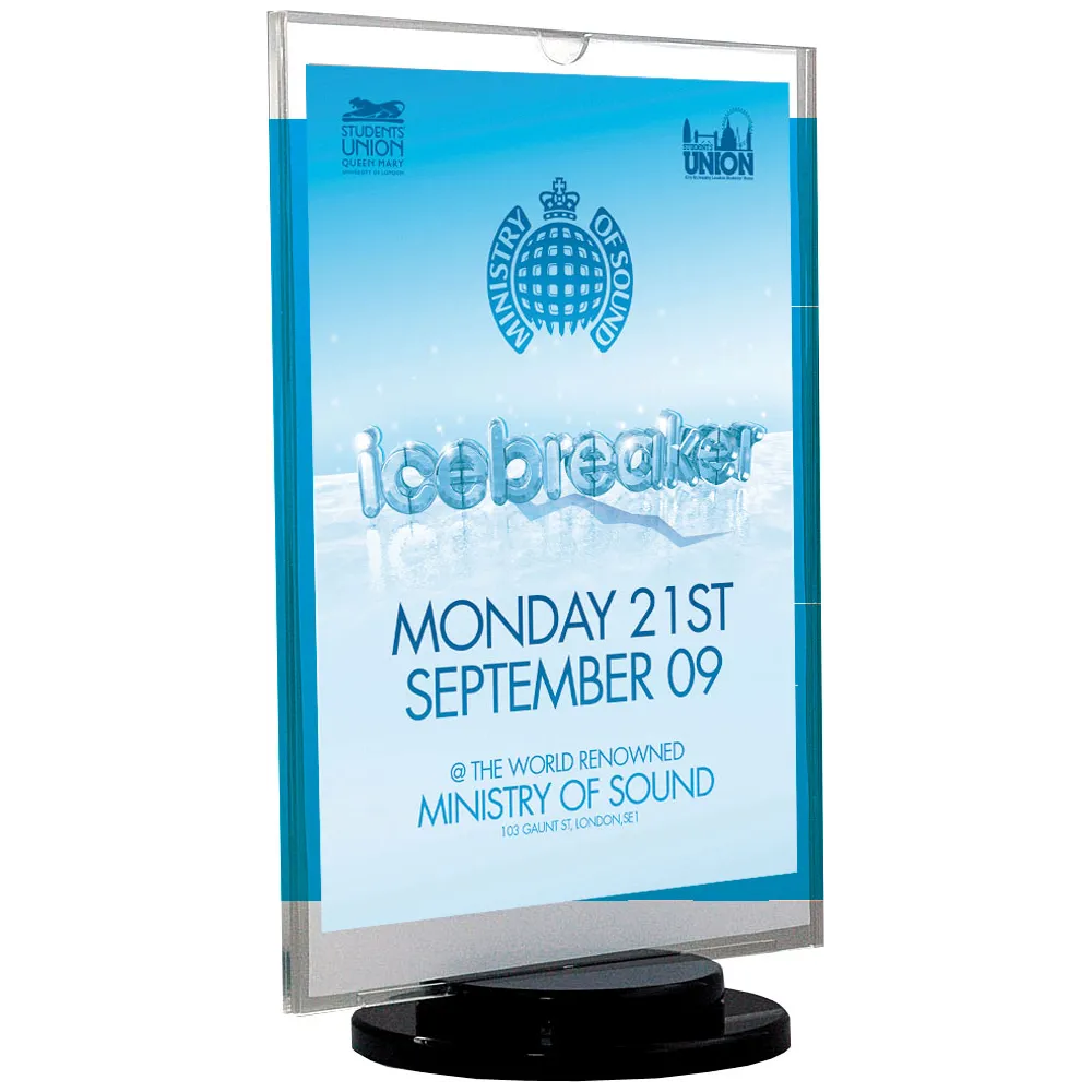 Brosjyreholder i klar akryl, med sort fot i akryl, som kan dreie 360 grader rundt.