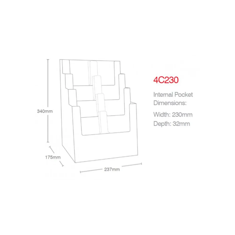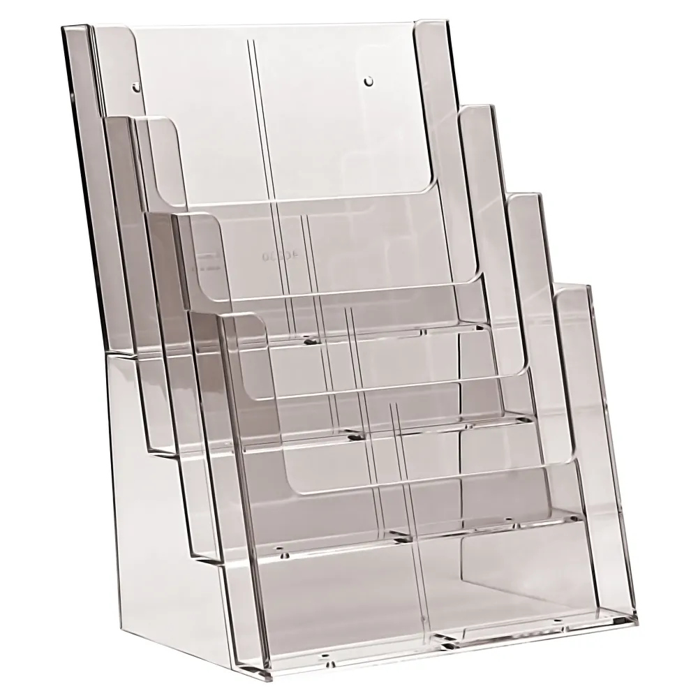 Vis mer Favoritt Brosjyreholder PS, 4 roms A4 Referanse: 328930 Brosjyreholder i klar polystyren, som kan benyttes både på bord og vegg. Favoritt