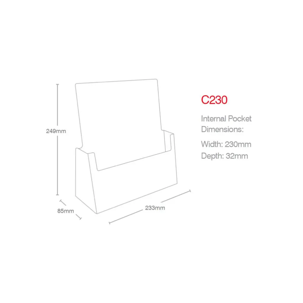 Vis mer Favoritt Brosjyreholder Bord A4 230x32mm-C230 Referanse: 362003 Brosjyreholder i klar akryl, som benyttes på bord. Favoritt