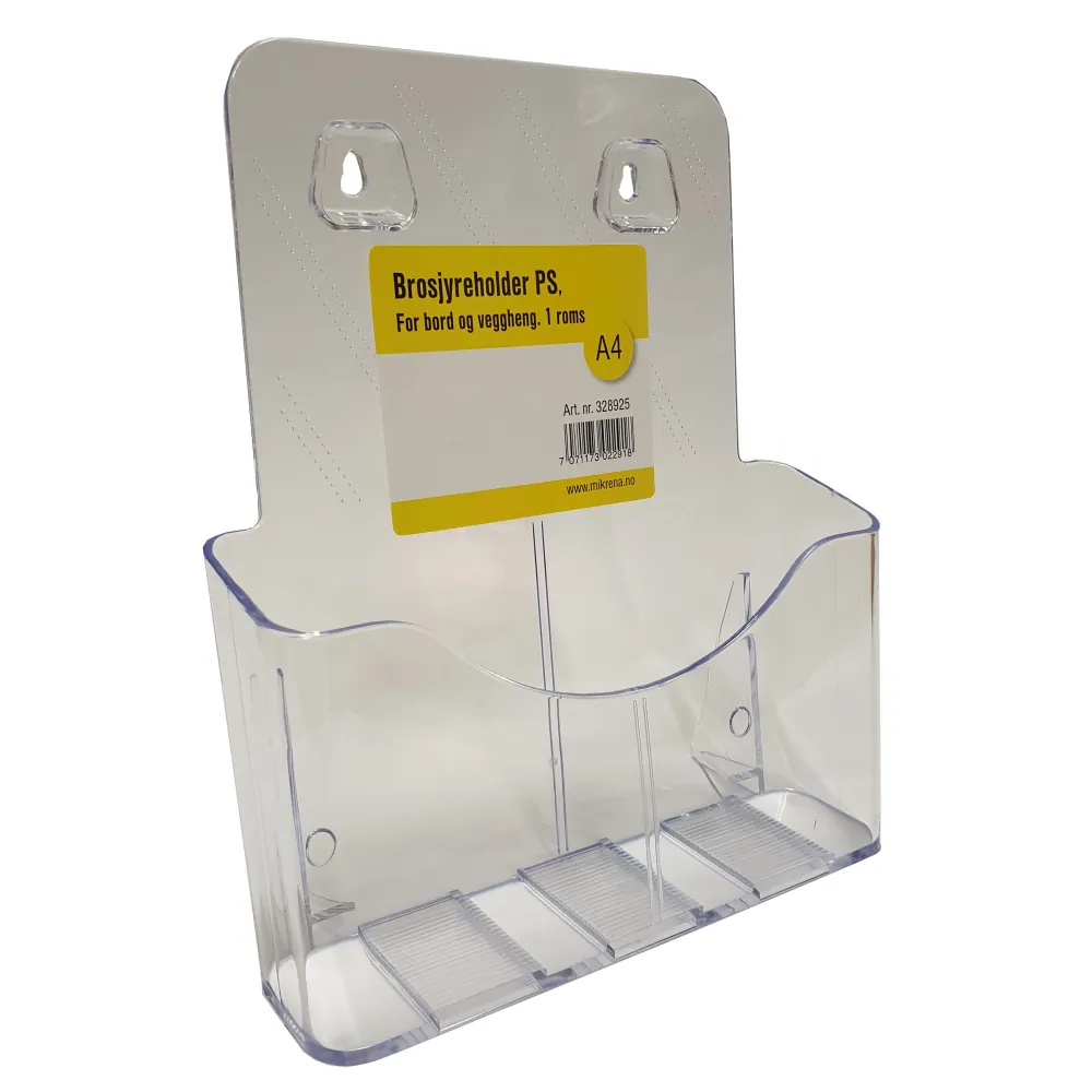 Brosjyreholder i klar polystyren, som kan benyttes både på bord og vegg.