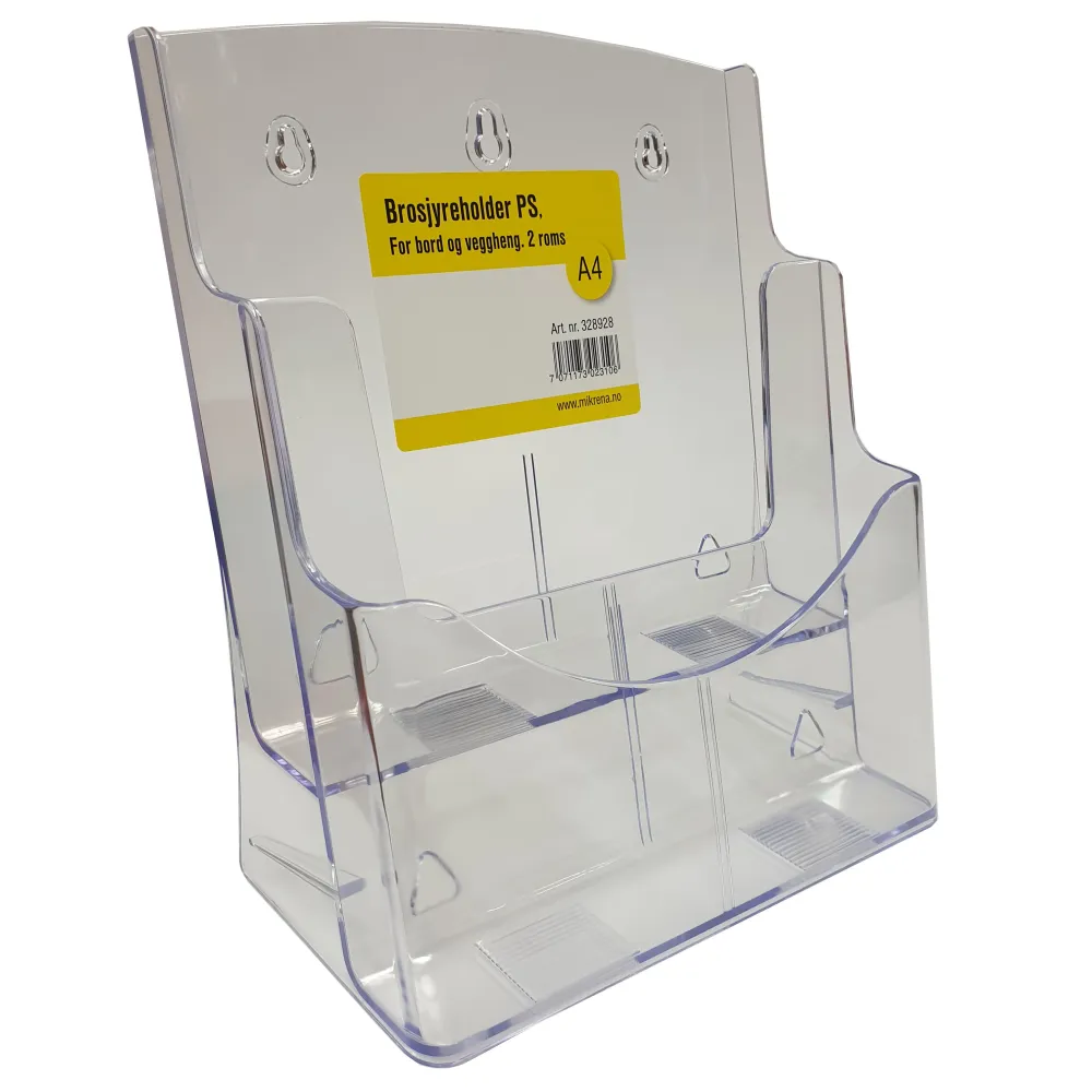 Brosjyreholder i klar polystyren, som kan benyttes både på bord og vegg.