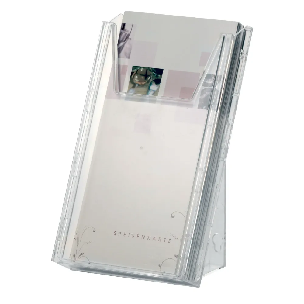 Transparent brosjyreholder til brosjyrer som også er litt bredere enn A4 stående.