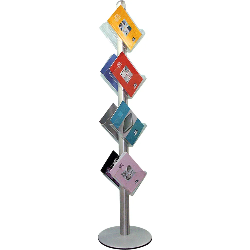 Dobbelsidig eloksert aluminium stander med 8 x A4 akrylhyller på skrå.