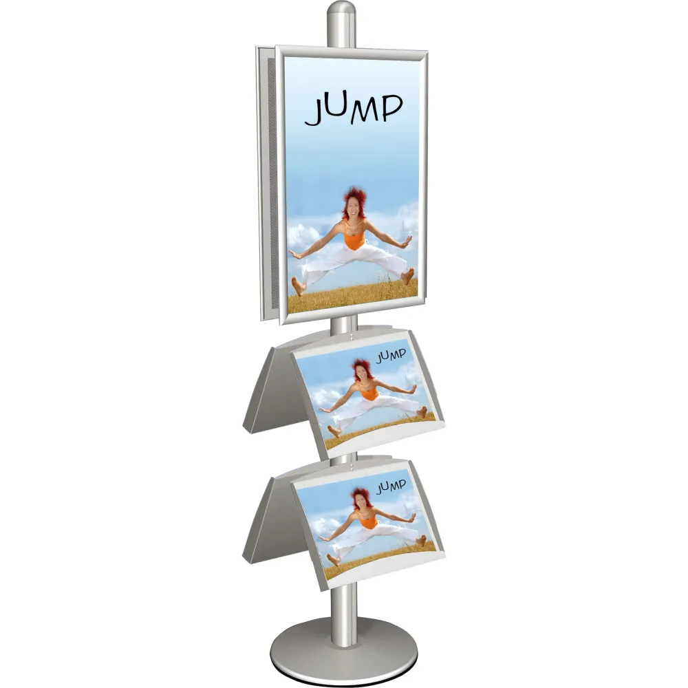 Dobbelsidig eloksert aluminium stander med 2 x 50x70 cm Snapramme 25mm og 4 x A3 stålhyller.