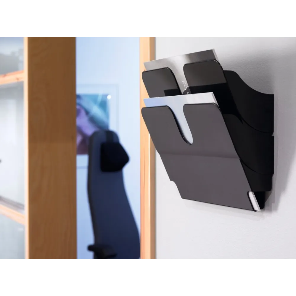 Brosjyreholder i A4 liggende. For veggmontering, skruer følger med.