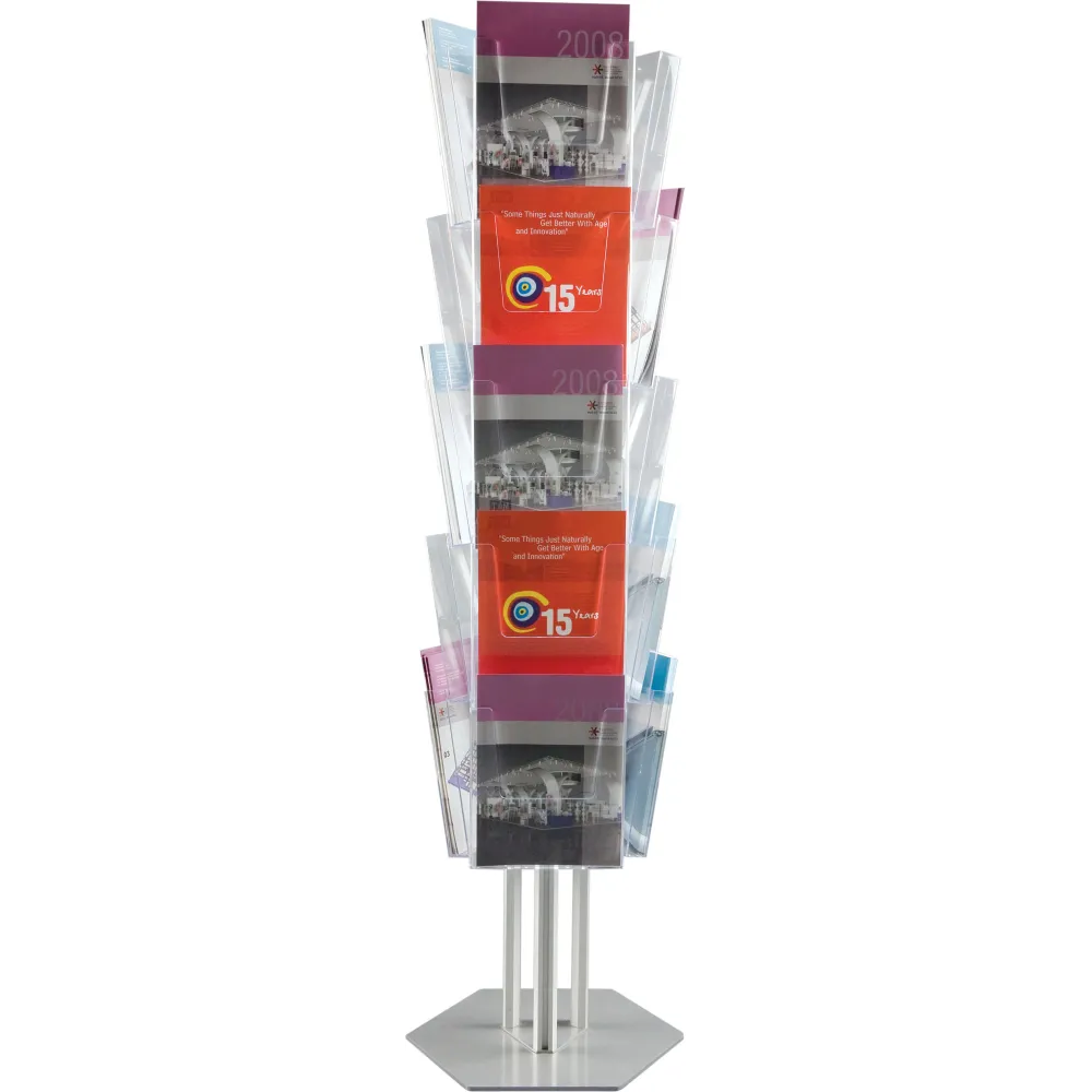 Alu brosjyreholder med tung pulverlakkert grå sekskantet fot i stål.