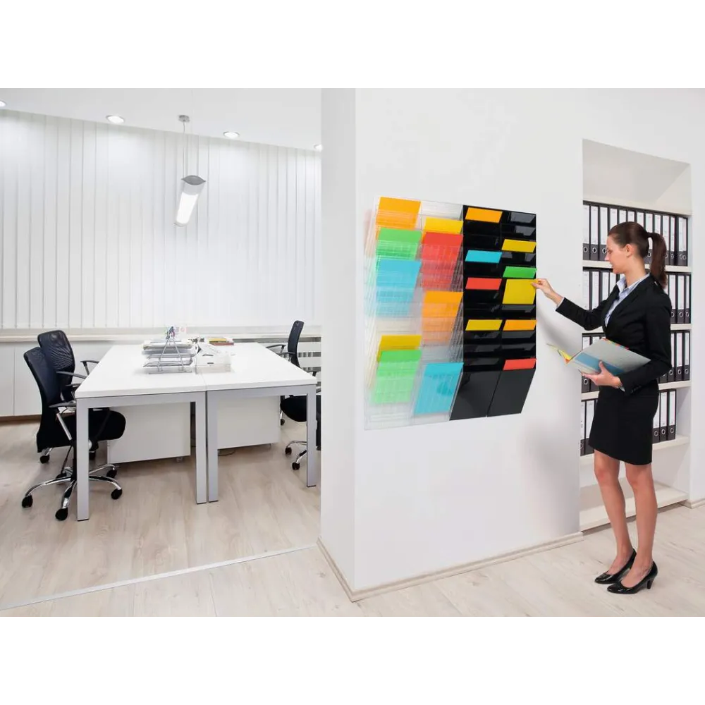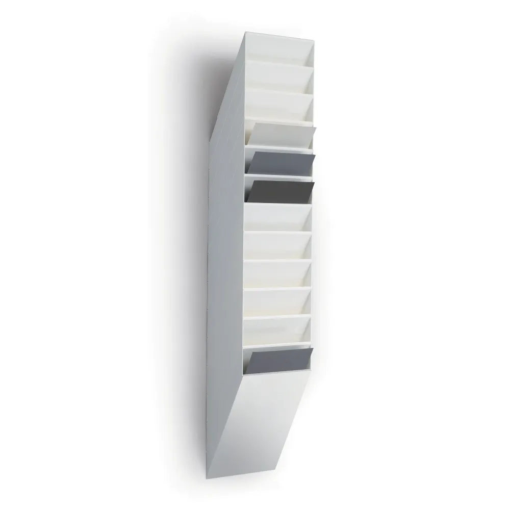 Påbyggbart brosjyrestativ med 12 rom og en frontplate, A4 stående.
