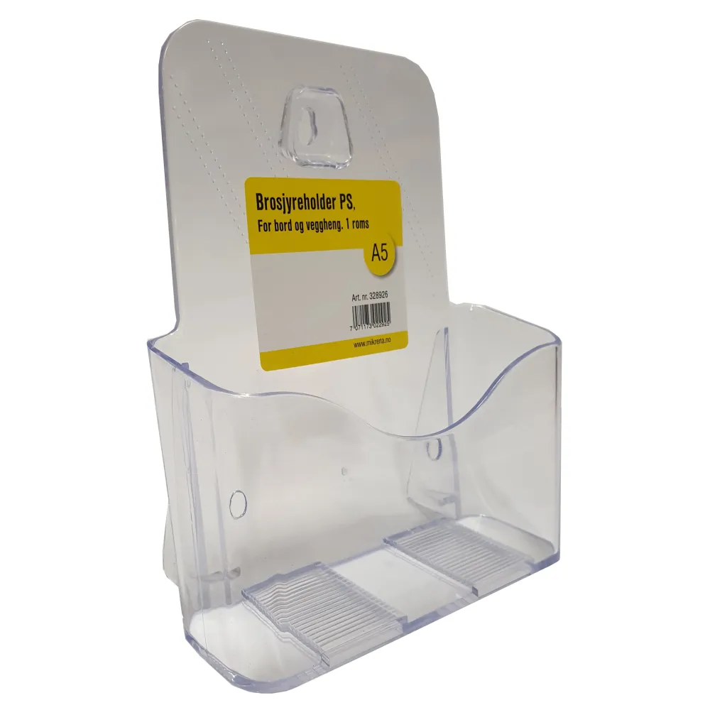 Brosjyreholder i klar polystyren, som kan benyttes både på bord og vegg.