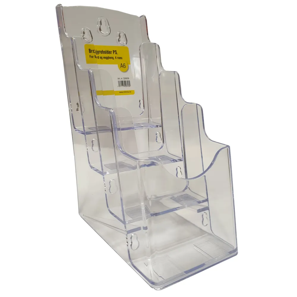 Brosjyreholder i klar polystyren, som kan benyttes både på bord og vegg.
