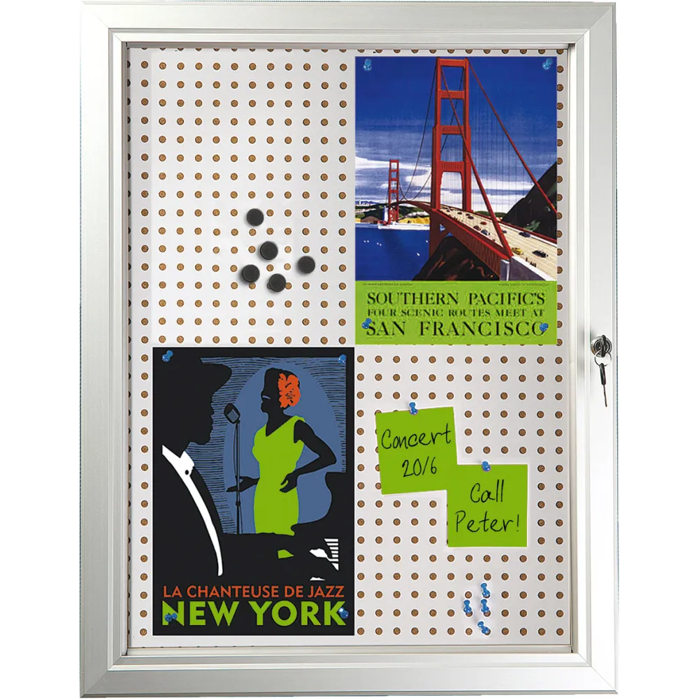 Låsbart skap med kork og hvit metallbakplate med 7mm hull. Til magneter eller stifter.