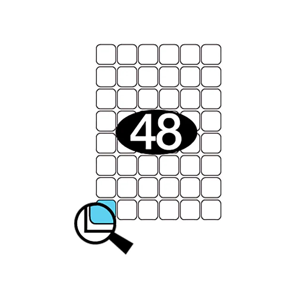 Til kopimaskiner, laserskrivere og blekkskrivere. 48 etiketter på hvert A4 ark i størrelse 30x30mm (BxH).6 etiketter bortover og 8 etiketter nedover.Rammekant rundt og mellom etikettene. Etikettene har runde hjørner.Selges i pakke á 100 ark.
