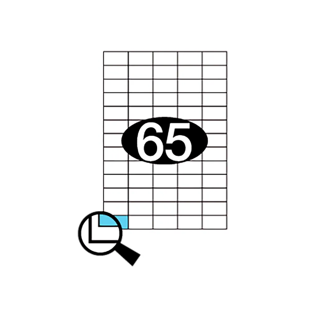 65 etiketter på hvert A4 ark i størrelse 38x21,2mm (BxH).