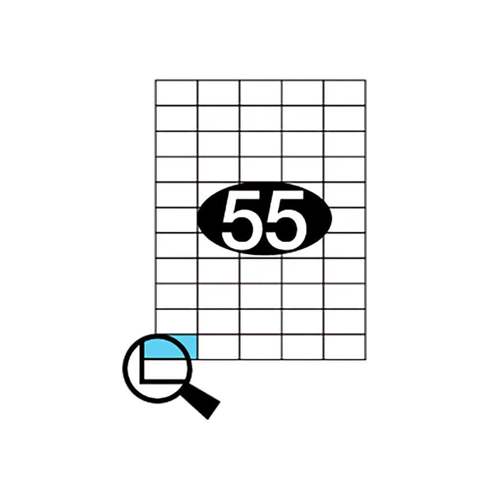 55 etiketter på hvert A4 ark i størrelse 42x25mm (BxH).