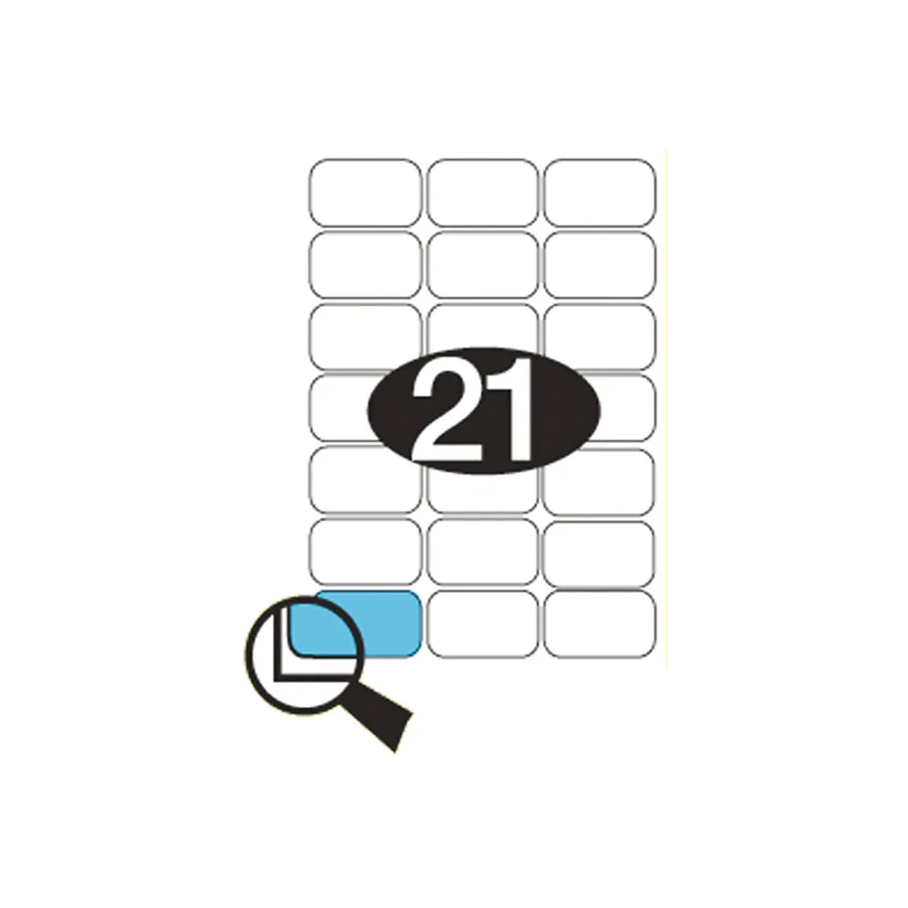 21 etiketter på hvert A4 ark i størrelse 63,5x38,1mm (BxH).