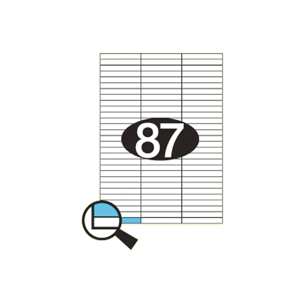 87 etiketter på hvert A4 ark i størrelse 70x10mm (BxH).