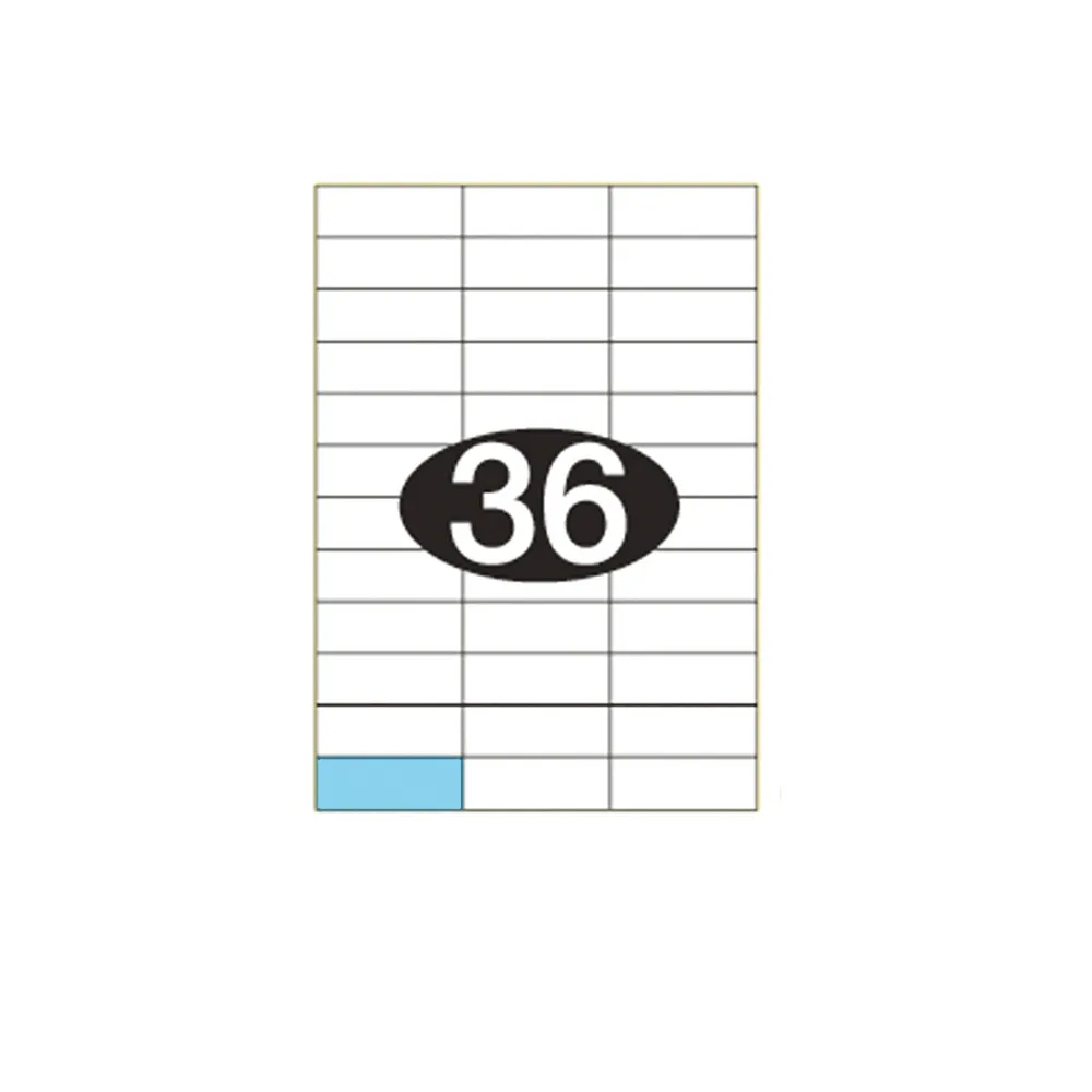 36 etiketter på hvert A4 ark i størrelse 70x24,74mm (BxH).