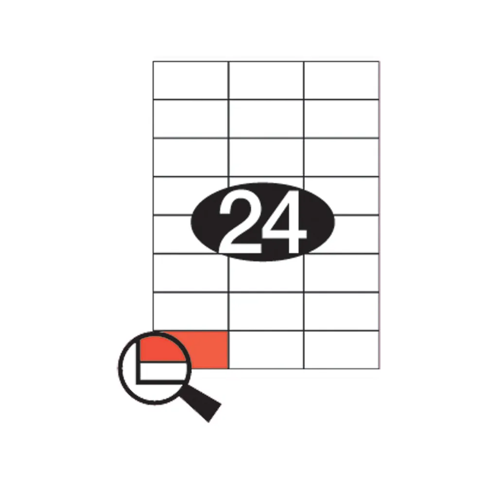 24 etiketter på hvert A4 ark i størrelse 70x36mm (BxH).