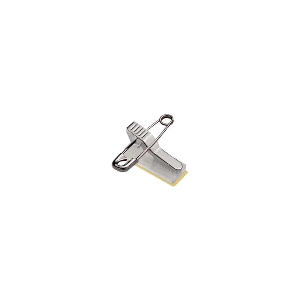 Metallholder med dobbelsidig tape, krokodilleklype og sikkerhetsnål.