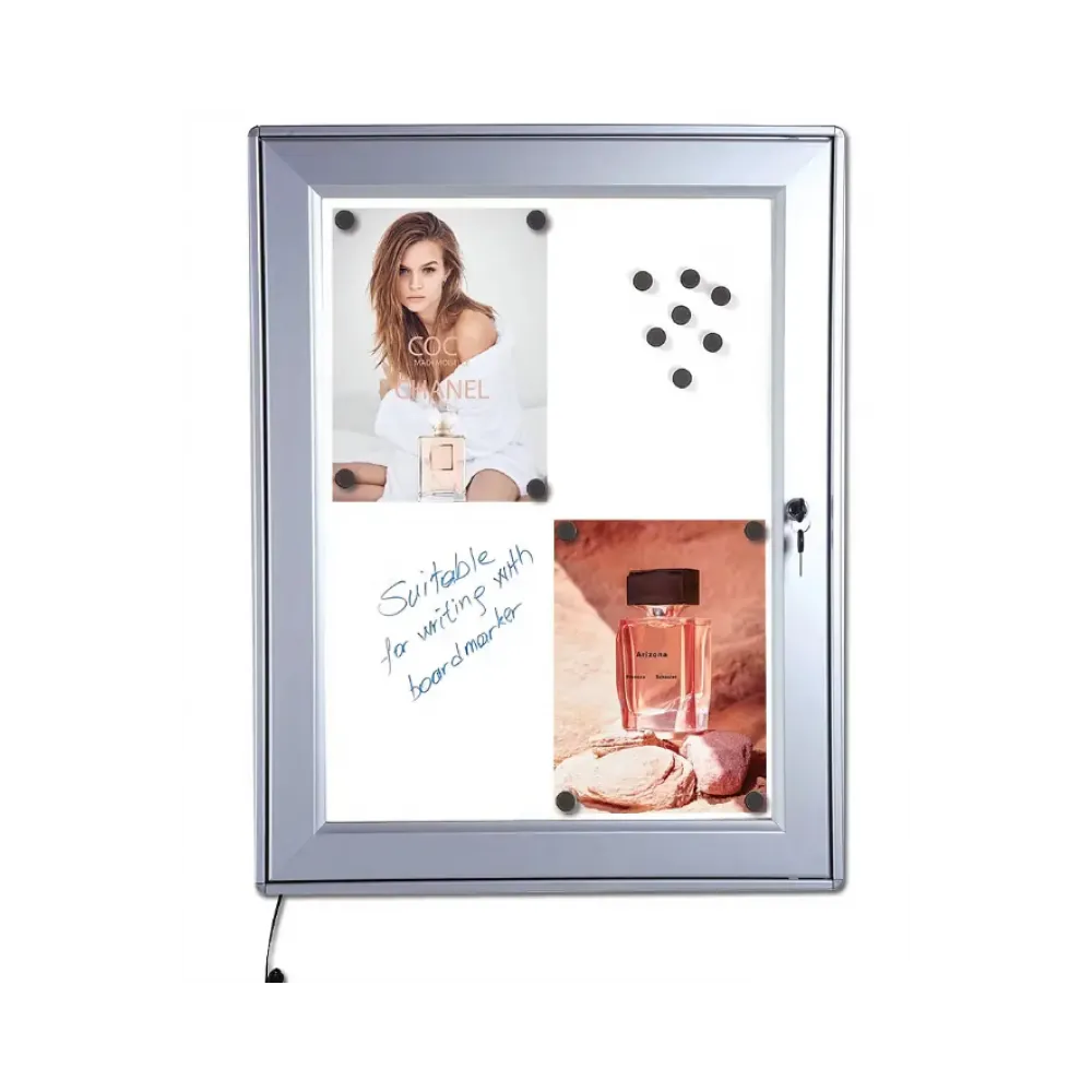 Låsbart infoskap med LED lys i topp og bunn. Leveres komplett med festemidler, og ett sett magneter. kan anvendes utendørs, men adapteret skal monteres innendørs.