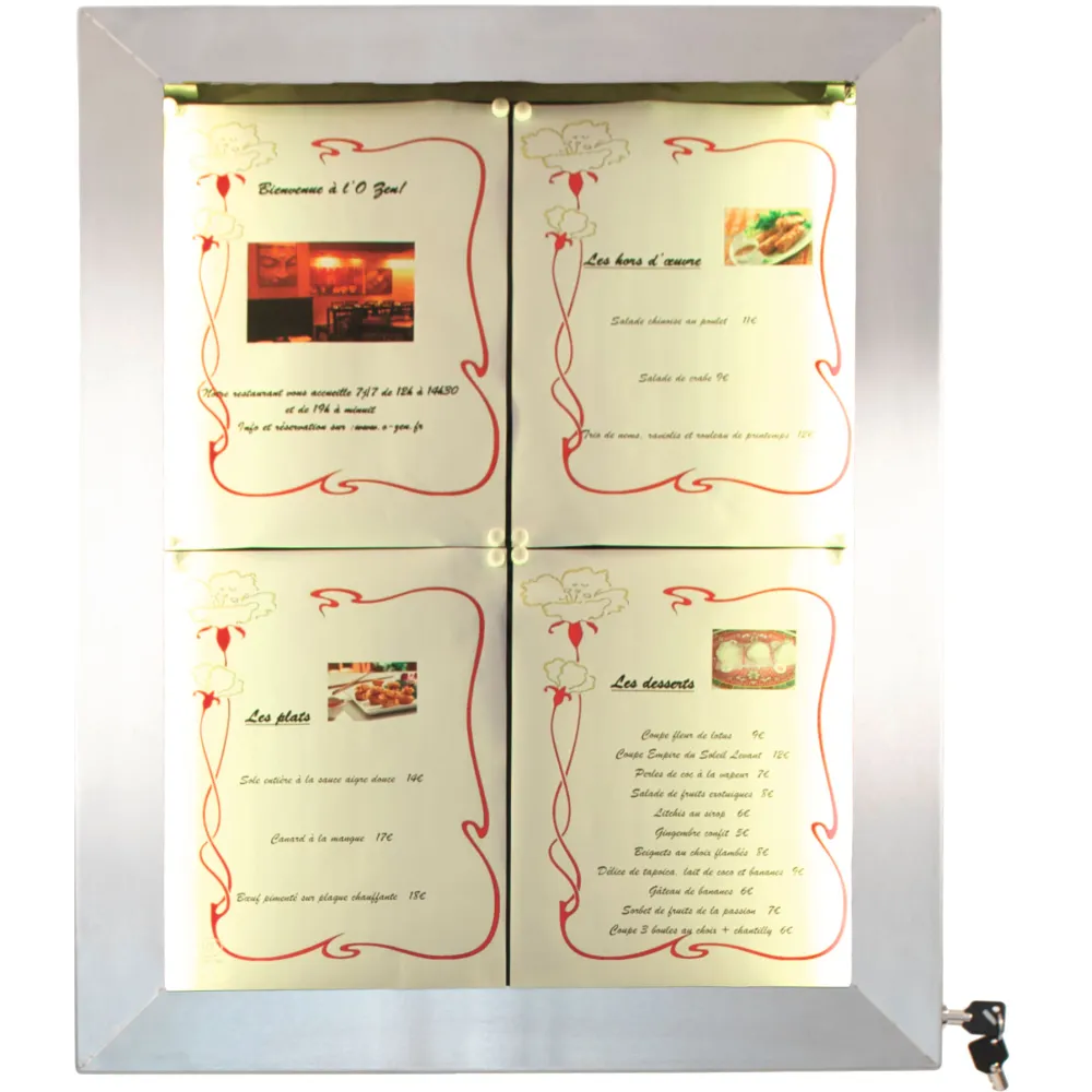Værbestandig meny display i rustfritt stål, med lås og LED lys.