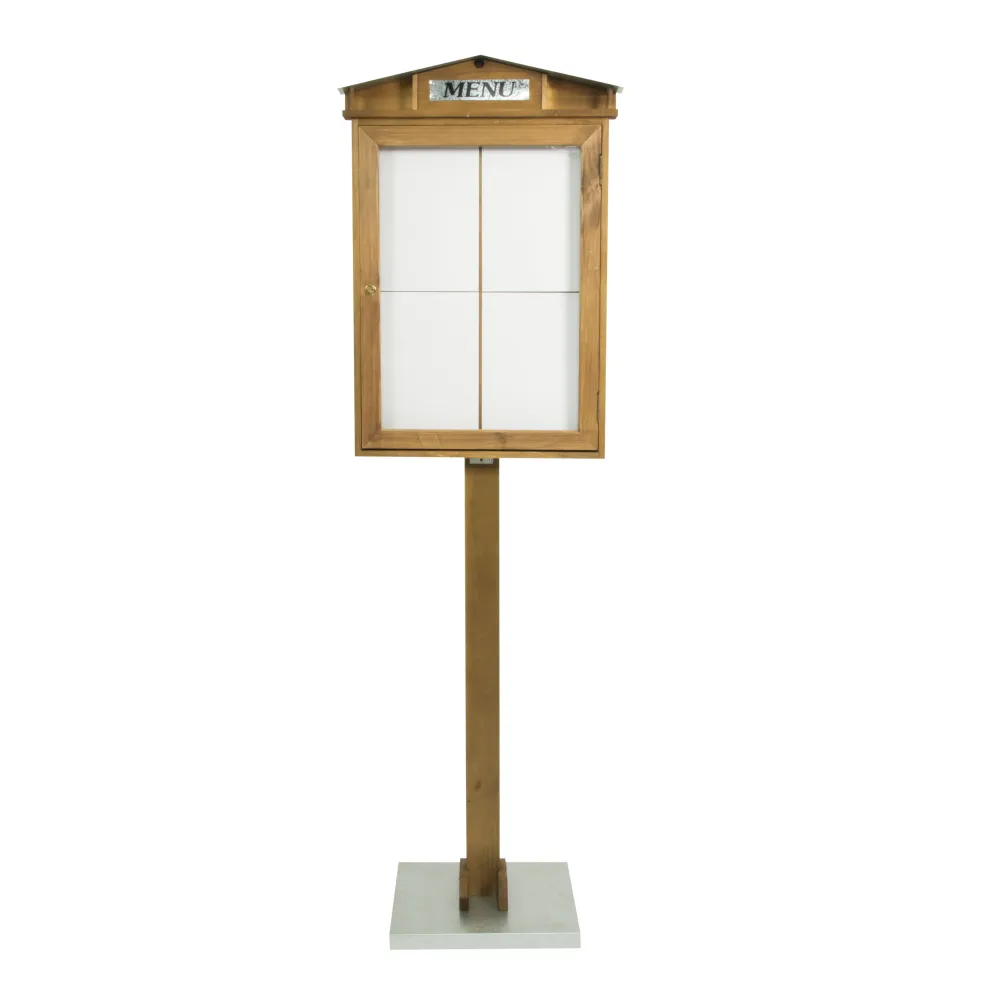 Værbestandig meny display i lakkert tre, med lås og hvite LED lys.Topp er belagt med sink.Komplett med stang og fot av sink.Strømforsyning og 5 m ledning er inkludert.