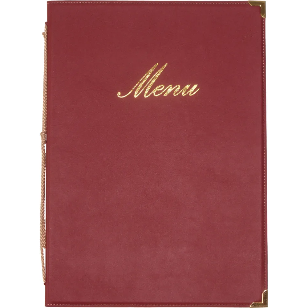 Omslag produsert i polyuretan. Meny er trykket i gull på forsiden.
