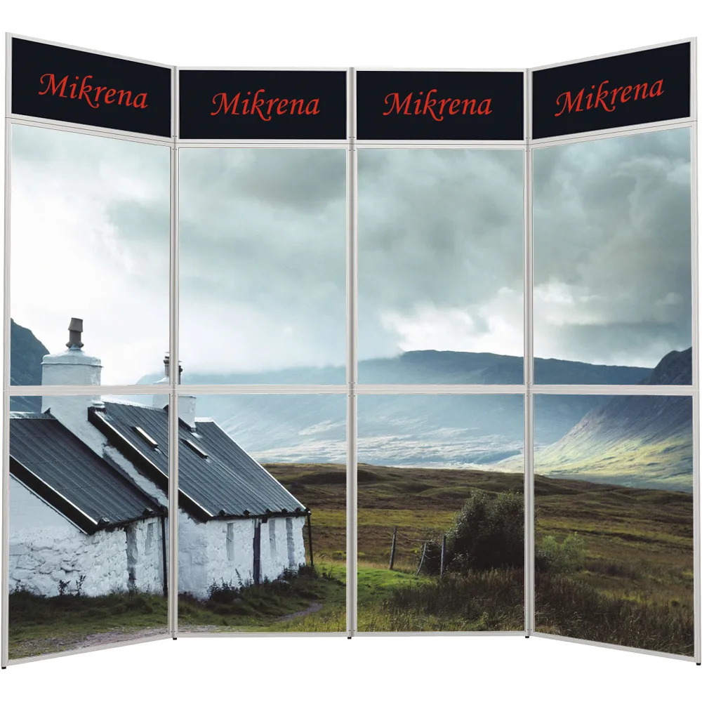 Utstillingsvegg med robuste sølvelokserte alurammer, som kan settes i vinkel, 0 - 360°.