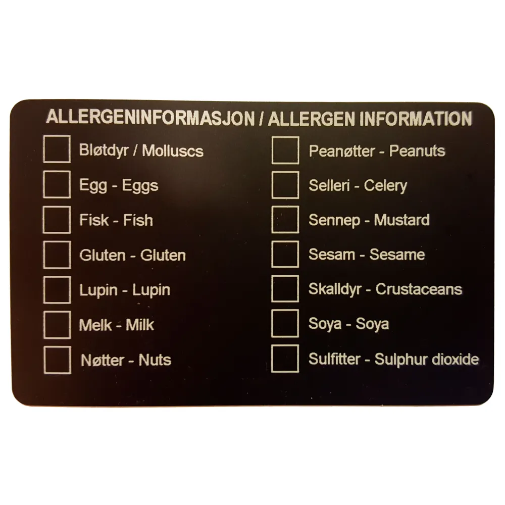 Kortet er ferdigtrykt med allergener, som krysses ut.