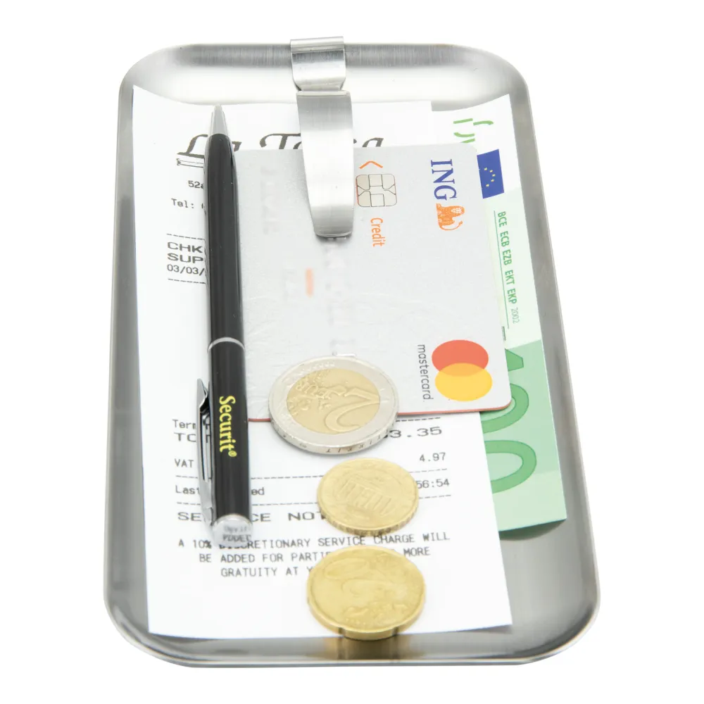 Regningsholder i ripebestandig metall, med en kraftig sortlakkert klype på toppen.