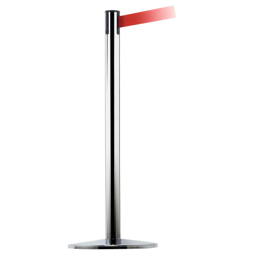 Sølvfarget stolpe, med rødt uttrekkbart bånd på 3m.