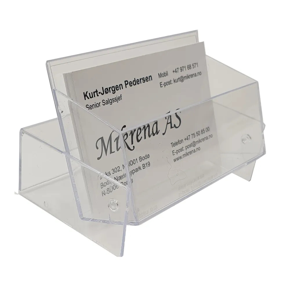 Visittkorteske og holder i klar akryl, som benyttes på bord.